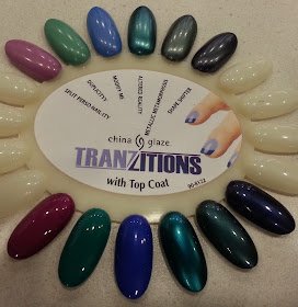 I was really excited to try these China Glaze Tranzitions. I wanted to get all of them (except Split Perso-Nail-Ity) and had not yet gotten around to getting any. Then my mom mentioned that she had gotten two. So I immediately had to play with them. And I was not so thrilled with the result. First let me show you the swatches that came on the wheel that stores were given. They are gorgeous. If the polishes worked this way for me I would be all over them!